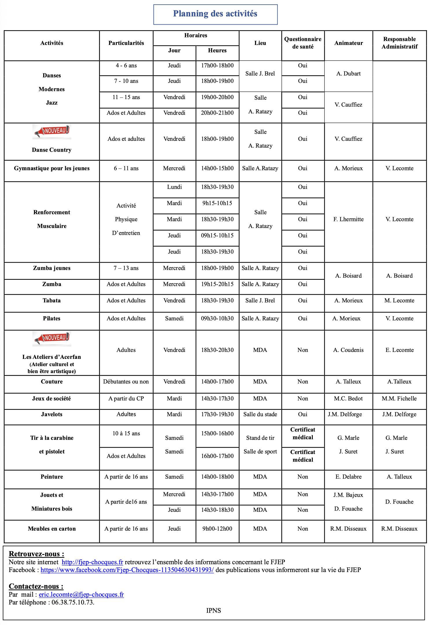 Reprise des activités le lundi 8 septembre 2025. Permanences pour les inscriptions : 2 et 4 septembre 2025 de 17h30 à 19h00 à la maison des associations.
